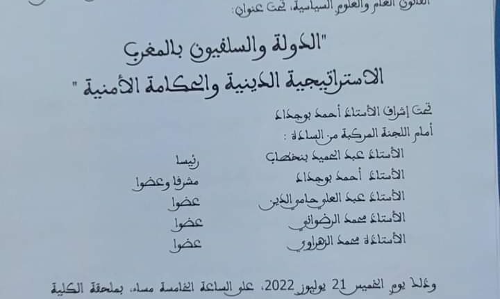 تناقش كلية الحقوق أكدال التابعة لجامعة محمد الخامس بالرباط أطروحة في القانون العام والعلوم السياسية، حول موضوع بعنوان: “الدولة والسلفيون بالمغرب : الاستراتيجية الدينية والحكامة الأمنية”