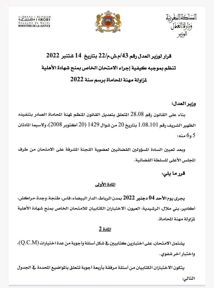 أعلن وزير العدل الأستاذ عبد اللطيف وهبي، في قرار صدر له مساء يوم الأربعاء 14 شتنبر 2022، عن موعد إجراء الامتحانات الخاصة بمنح شهادة الأهلية لمزاولة مهنة المحاماة، الذي هو يوم 4 دجنبر 2022