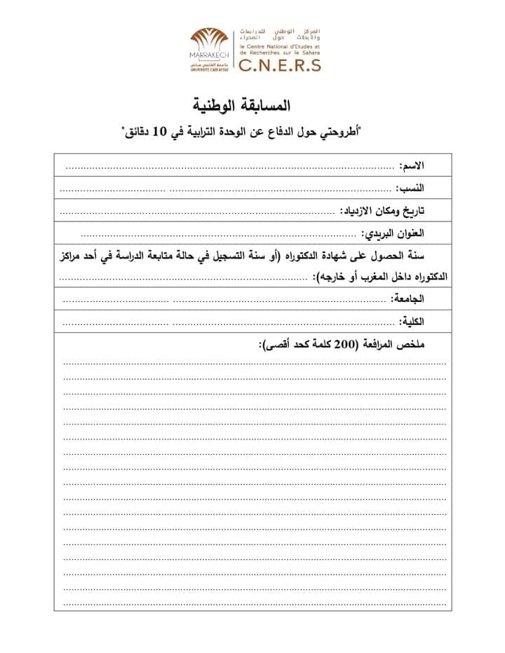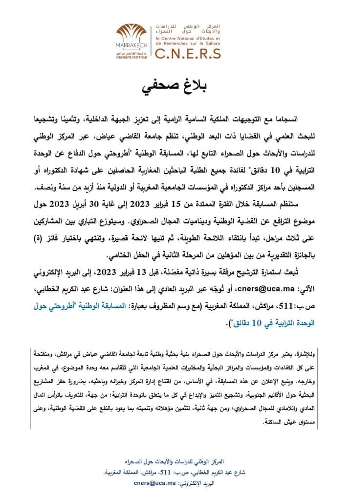 ينظم “المركز الوطني للدراسات والأبحاث حول الصحراء”، التابع لجامعة القاضي عياض بمراكش، مسابقة الوطنية ” أطروحتي حول الدفاع عن الوحدة الترابية وديناميات المجال الصحراوي في 10 دقائق”، وذلك لفائدة الباحثات والباحثين المغاربة الحاصلين على شهادة الدكتوراه أو المسجلين بأحد مراكز الدكتوراه في المؤسسات الجامعية المغربية أو الدولية.