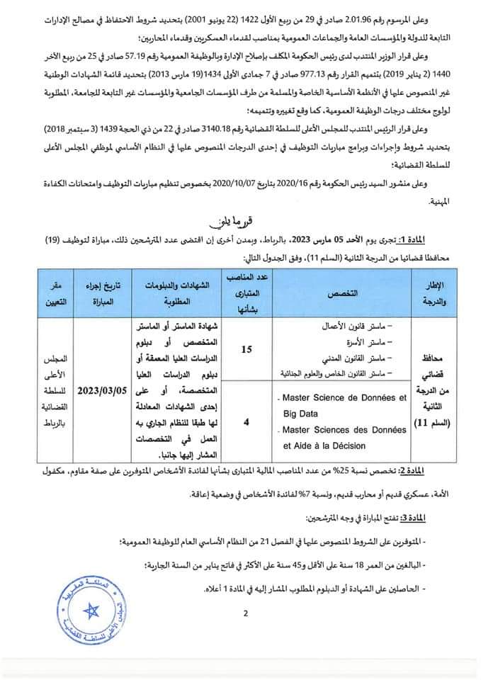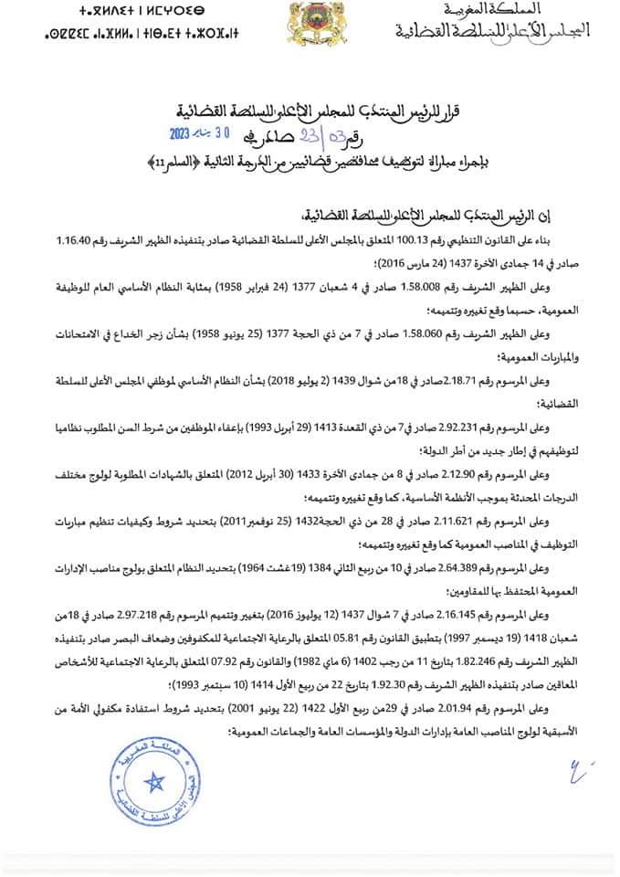 إعلان: مباراة توظيف محافظين قضائيين من الدرجة الثانية السلم 11 في فبراير 3, 2023 أعلن المجلس الأعلى للسلطة القضائية بالمغرب عن تنظيم مباراة لتوظيف محافظين قضائيين من الدرجة الثانية السلم 11. القرار: شارك FacebookTwitterGoogle+ReddItWhatsAppPinterestالبريد الإلكتروني