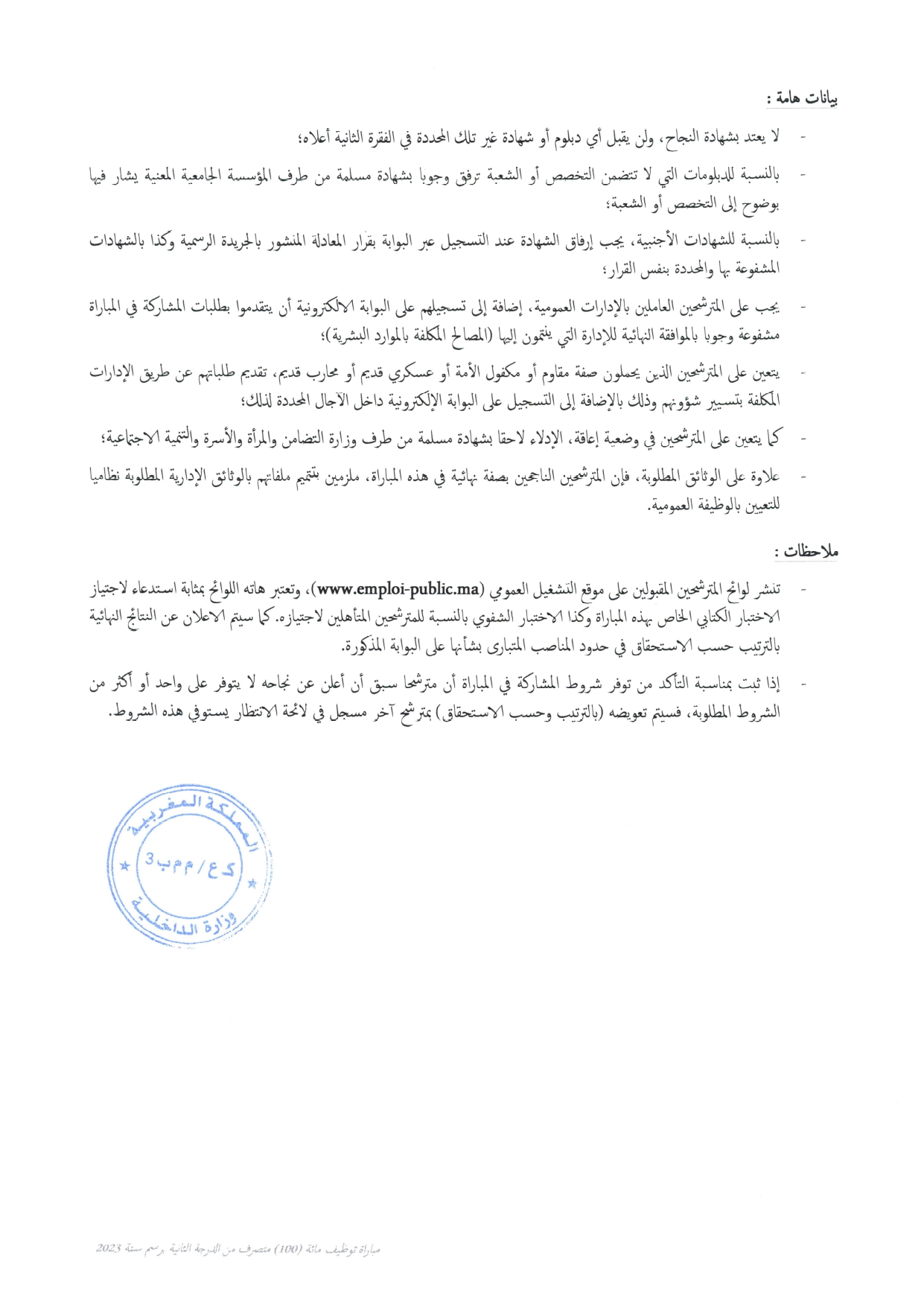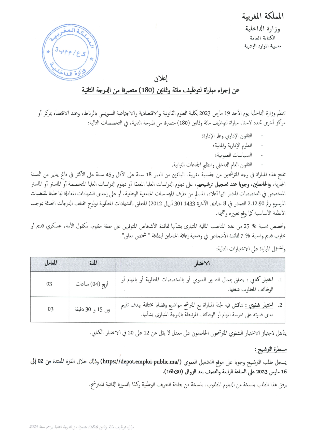 مباراة توظيف 280 متصرف من الدرجة الثانية بوزارة الداخلية آخر أجل 16 مارس 2023 في مارس 4, 2023 أعلنت وزارة الداخلية عن إجراء مباراة توظيف 280 متصرف من الدرجة الثانية آخر أجل 16 مارس 2023 أنظر الإعلان التالي: شارك FacebookTwitterGoogle+ReddItWhatsAppPinterestالبريد الإلكتروني