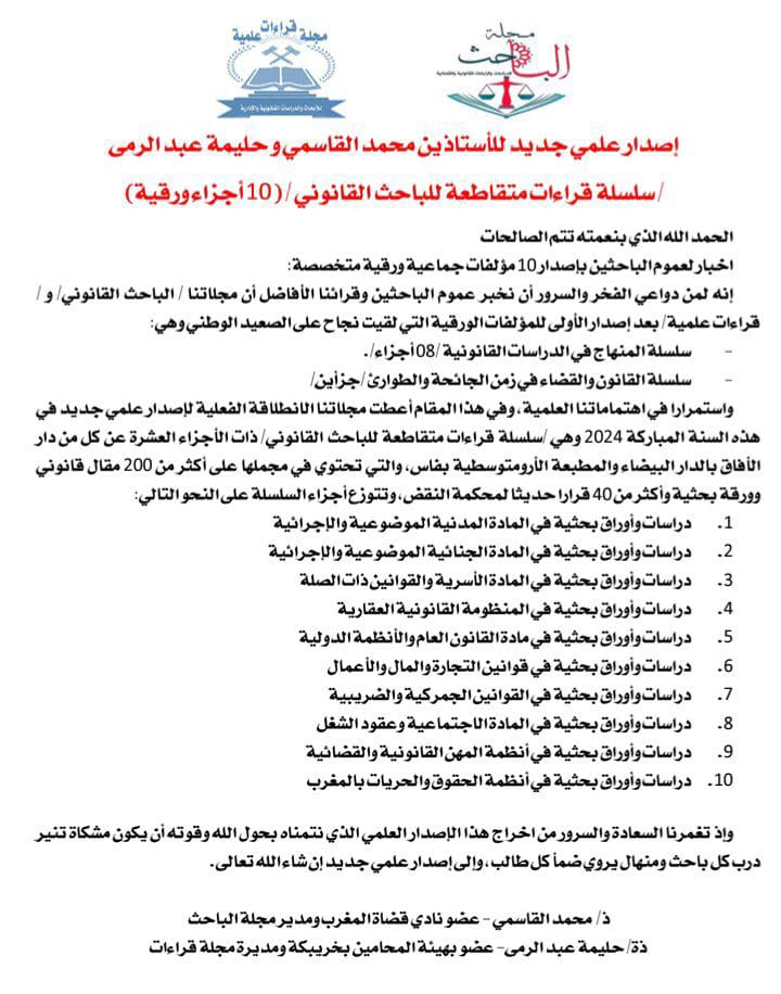 صدر حديثا للأستاذ محمد القاسمي، مدير مجلة الباحث، والأستاذة حليمة عبد الرمى، مديرة مجلة قراءات علمية، إصدار جديد مشترك معنون ب: “سلسلة قراءات متقاطعة للباحث القانوني”.