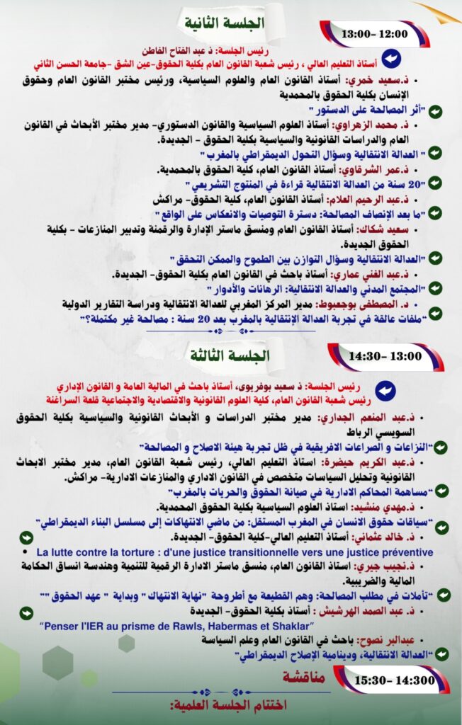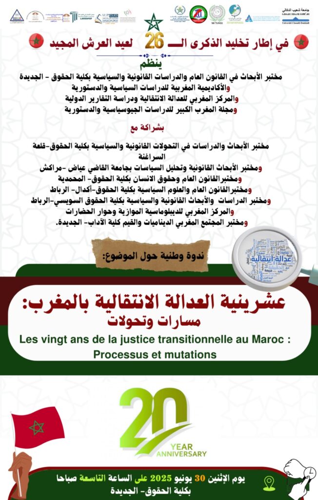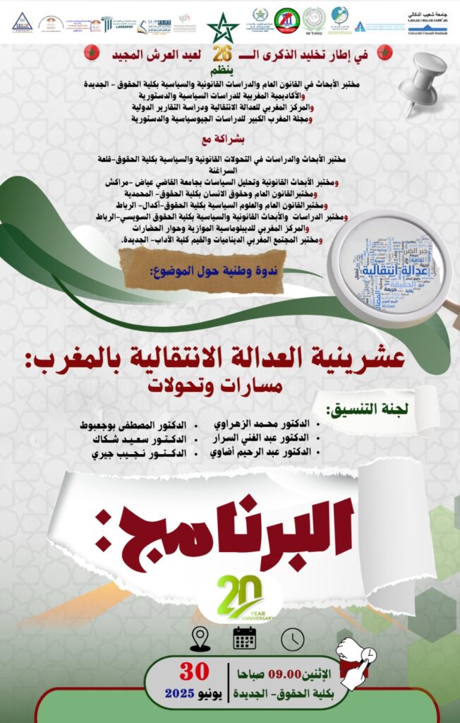 ينظم مختبر الأبحاث في القانون العام والدراسات القانونية والسياسية بكلية الحقوق – الجديدة، والأكاديمية المغربية للدراسات السياسية والدستورية، والمركز المغربي للعدالة الانتقالية ودراسة التقارير الدولية، ومجلة المغرب الكبير للدراسات الجيوسياسية والدستورية