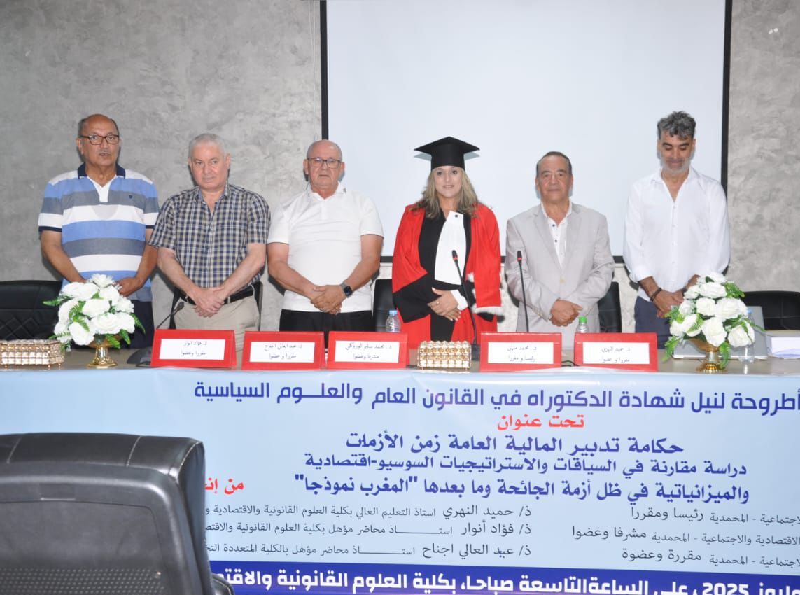 شهد مركز الدراسات القانونية والسياسية والاجتماعية والاقتصادية والمجتمع، بكلية العلوم القانونية والاقتصادية والاجتماعية بالمحمدية، يوم الخميس 31 يوليوز 2025 حدثا أكاديميا مهما، حيث ناقشت الطالبة الباحثة سمية بومروان أطروحتها لنيل شهادة الدكتوراه في القانون العام والعلوم السياسية، تحت إشراف الأستاذ الدكتور “محمد سليم لورياكلي”، وسط حضور رفيع المستوى من أساتذة وباحثين وخبراء في مجالات المالية العامة والسياسات الاقتصادية والميزانياتية.