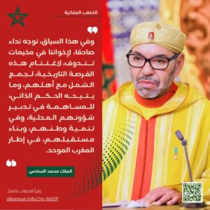 يُجسّد هذا الخطاب الرؤية المتبصرة لصاحب الجلالة الملك محمد السادس نصره الله في ترسيخ الوحدة الوطنية، وتعزيز روح التضامن والانخراط في تنمية الأقاليم الجنوبية وبناء المغرب الموحد.