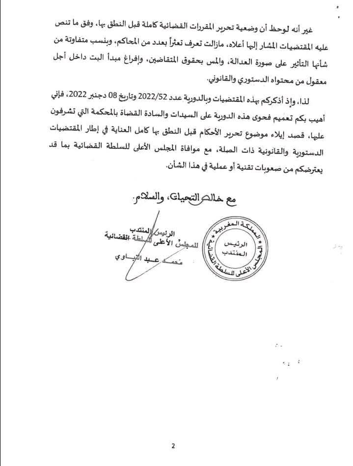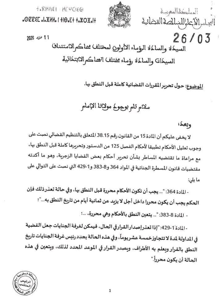 دورية الرئيس المنتدب للمجلس الأعلى للسلطة القضائية حول إلزامية تحرير الأحكام قبل النطق بها