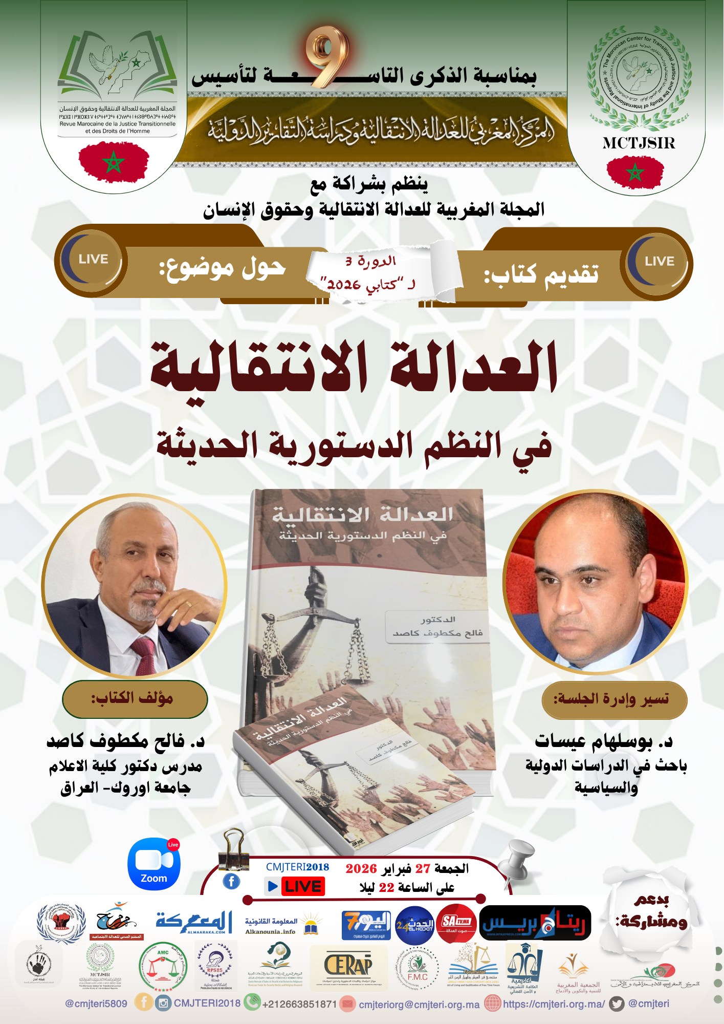 يستضيف هذا اللقاء العلمي مؤلف الكتاب الدكتور فالح مكطوف كاصد، المدرس بكلية الإعلام في جامعة أوروك بجمهورية العراق، ليقدم للجمهور الأكاديمي والباحثين خلاصات مؤلفه وما يحمله من رؤى نظرية وتحليلات واقعية لمكانة العدالة الانتقالية في الوثائق الدستورية المعاصرة. ويتولى تسيير وإدارة أطوار هذه الجلسة العلمية الدكتور بوسلهام عيسات، الباحث في الدراسات الدولية والعلوم السياسية، مما يضمن تدفقا معرفيا ونقاشا أكاديميا يزاوج بين السياقات الوطنية والدولية لهذا الموضوع الراهن.