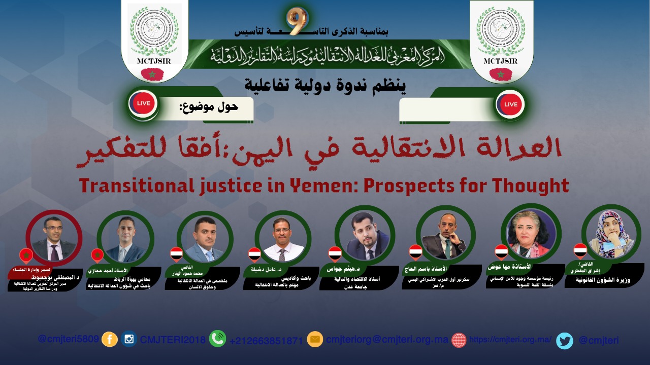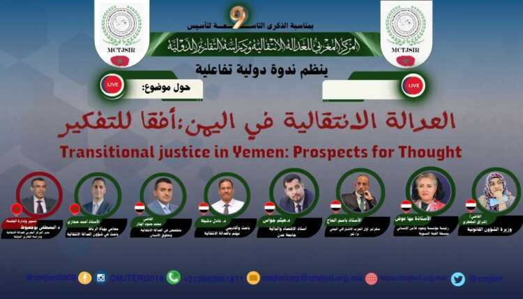 في إطار اهتمامه بقضايا العدالة الانتقالية، يستعد المركز المغربي للعدالة الانتقالية ودراسة التقارير الدولية لتنظيم ندوة دولية تفاعلية حول موضوع “العدالة الانتقالية في اليمن: آفاق للتفكير”، بمشاركة باحثين وقانونيين وفاعلين مدنيين.