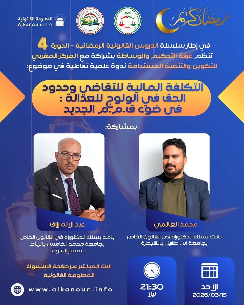 وفي هذا السياق، تنظم ندوة علمية تفاعلية حول موضوع: “التكلفة المالية للتقاضي وحدود الحق في الولوج إلى العدالة في ضوء قانون المسطرة المدنية الجديد”، وذلك يوم الأحد 15 مارس 2026 على الساعة 21:30 ليلا (بتوقيت GMT)، عبر البث المباشر على صفحة “المعلومة القانونية”. ويأتي اختيار هذا الموضوع في سياق النقاش الدائر حول مستجدات مشروع قانون المسطرة المدنية، وما يطرحه من تساؤلات مرتبطة بتوازن المنظومة الإجرائية بين متطلبات فعالية العدالة وضمان الحق في التقاضي.