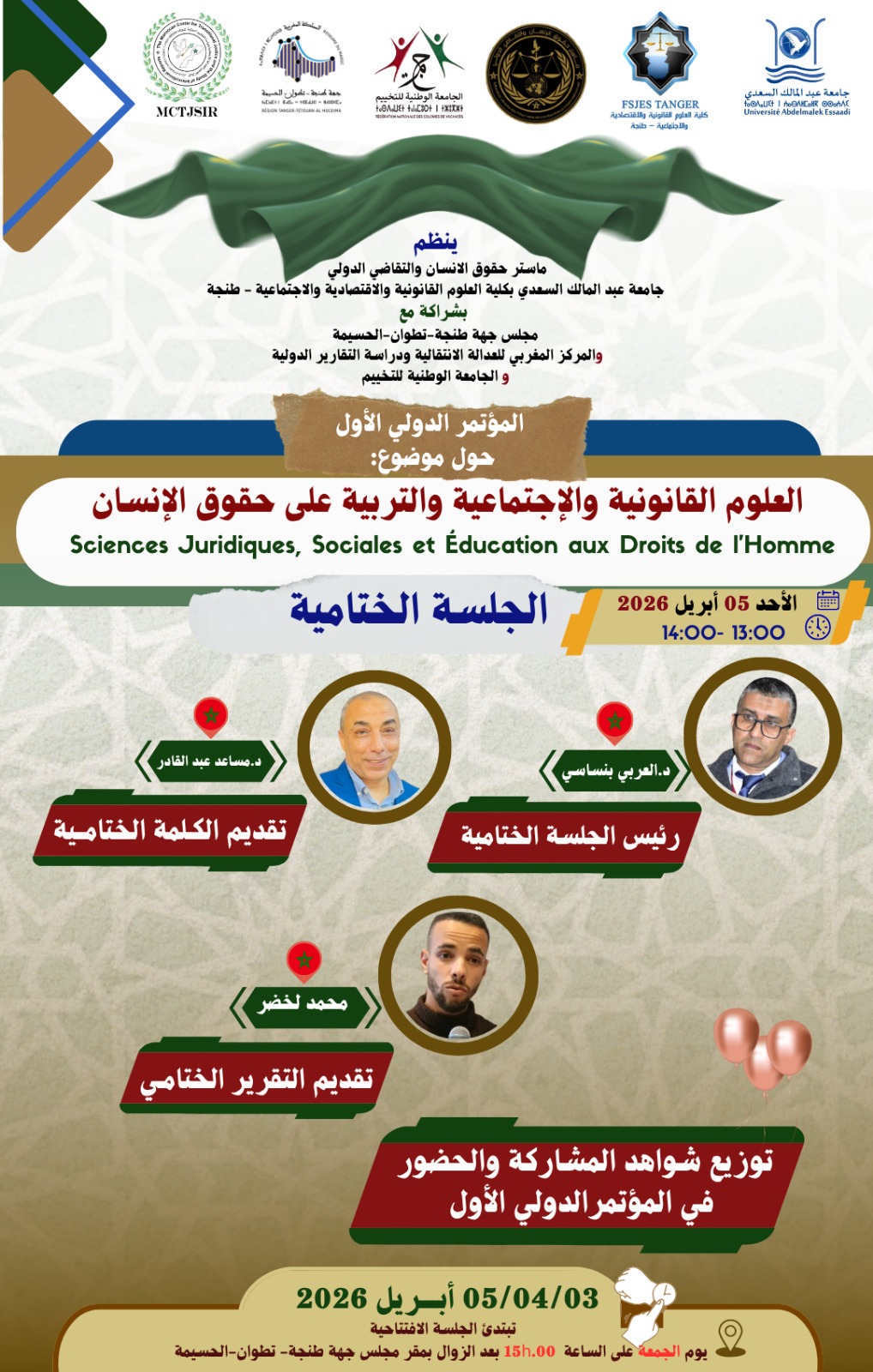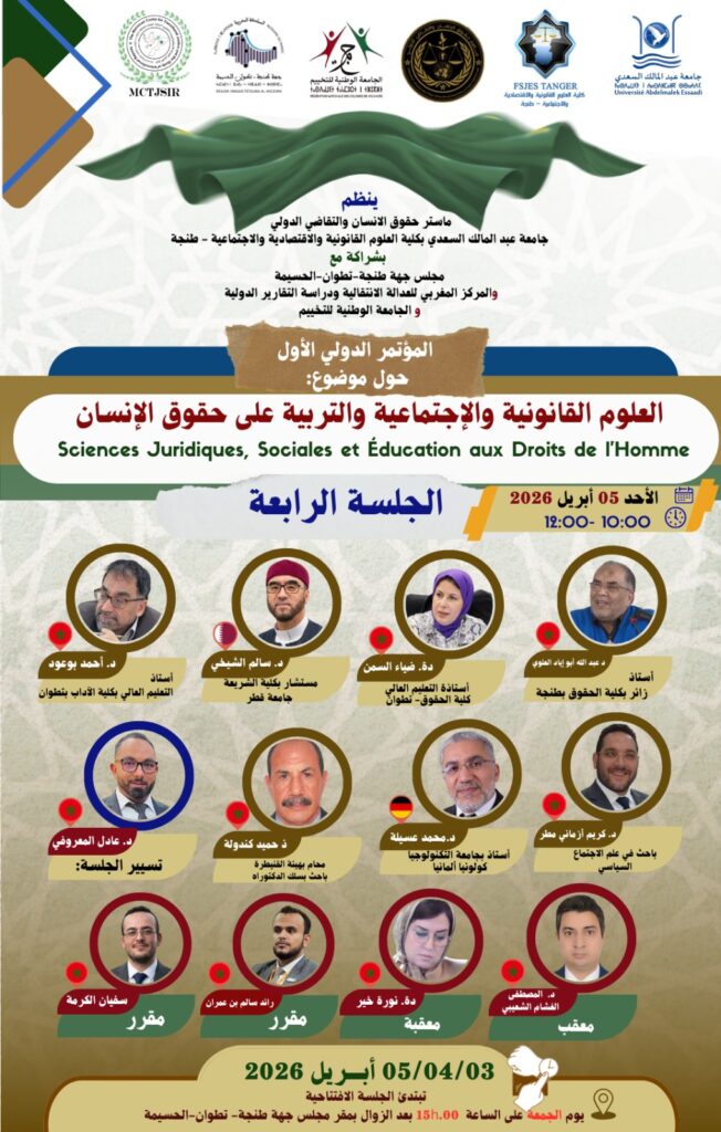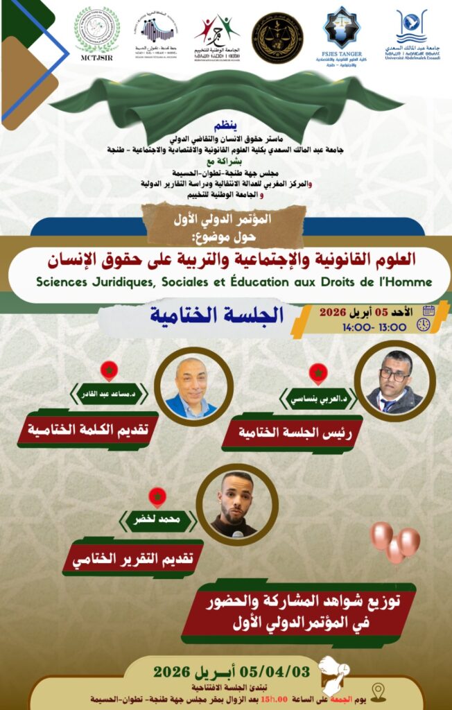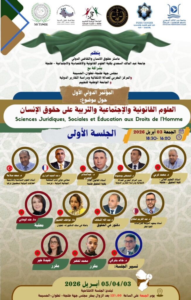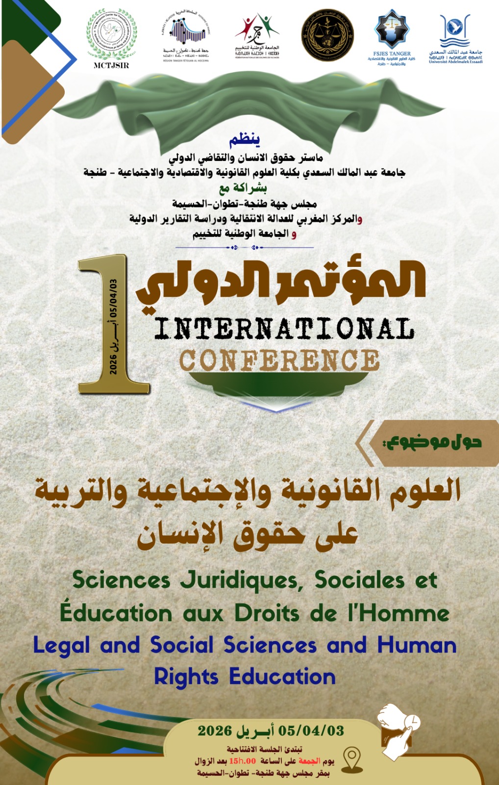 تحتضن مدينة طنجة، خلال الفترة من 03 إلى 05 أبريل 2026، فعاليات المؤتمر الدولي الأول حول “العلوم القانونية والاجتماعية والتربية على حقوق الإنسان”، الذي تنظمه جامعة عبد المالك السعدي، كلية العلوم القانونية والاقتصادية والاجتماعية طنجة، ماستر حقوق الإنسان والتقاضي الدولي، بشراكة مع مجلس جهة طنجة تطوان الحسيمة، والمركز المغربي للعدالة الانتقالية ودراسة التقارير الدولية، والجامعة الوطنية للتخييم.