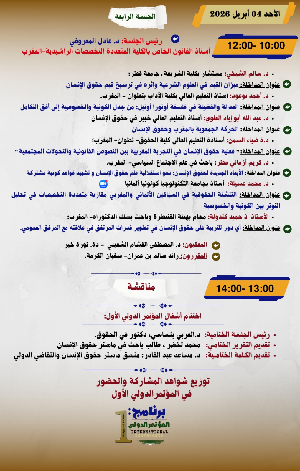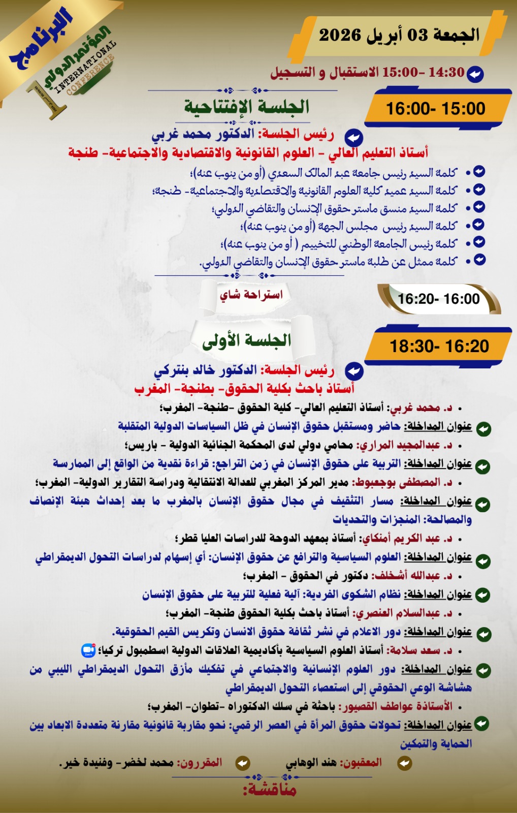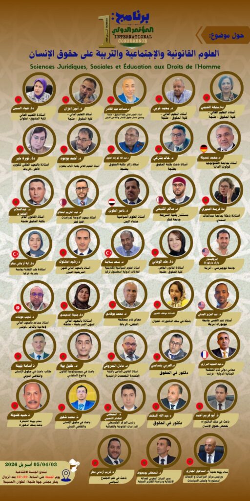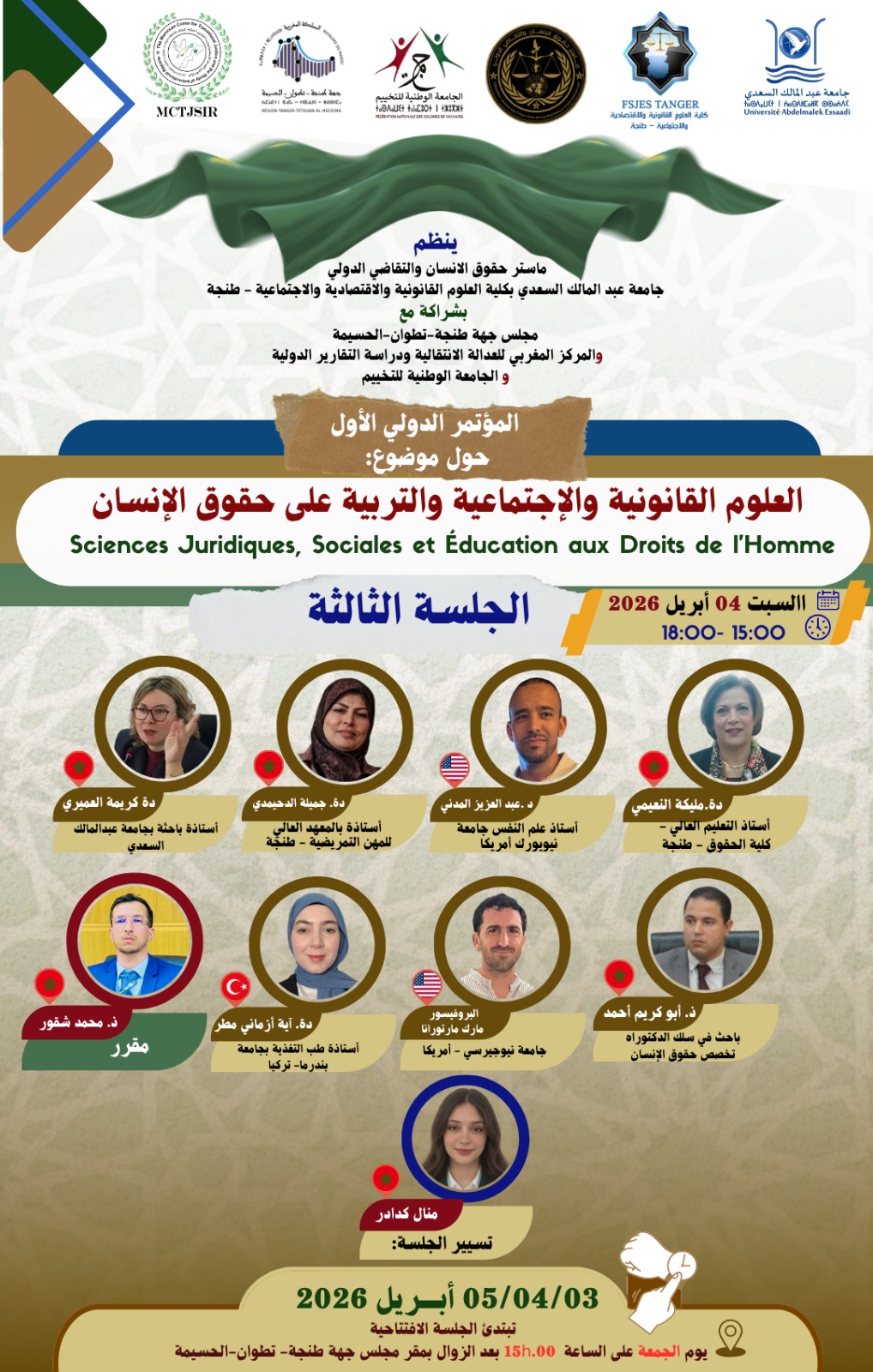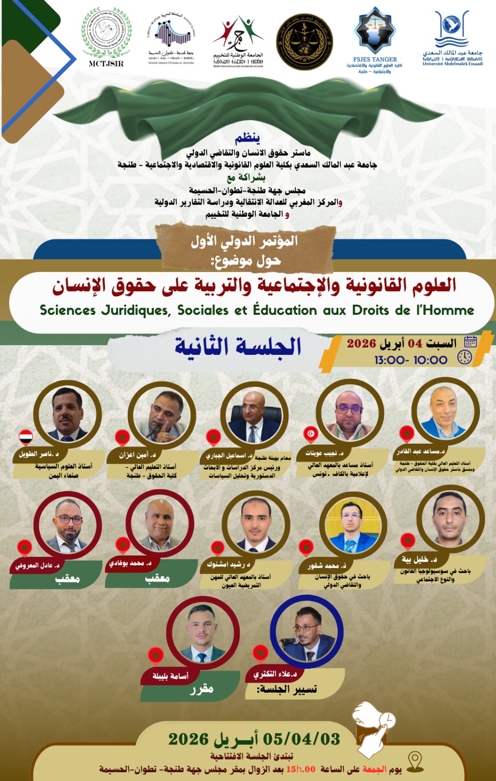 تحتضن مدينة طنجة، خلال الفترة من 03 إلى 05 أبريل 2026، فعاليات المؤتمر الدولي الأول حول “العلوم القانونية والاجتماعية والتربية على حقوق الإنسان”، الذي تنظمه جامعة عبد المالك السعدي، كلية العلوم القانونية والاقتصادية والاجتماعية طنجة، ماستر حقوق الإنسان والتقاضي الدولي، بشراكة مع مجلس جهة طنجة تطوان الحسيمة، والمركز المغربي للعدالة الانتقالية ودراسة التقارير الدولية، والجامعة الوطنية للتخييم.