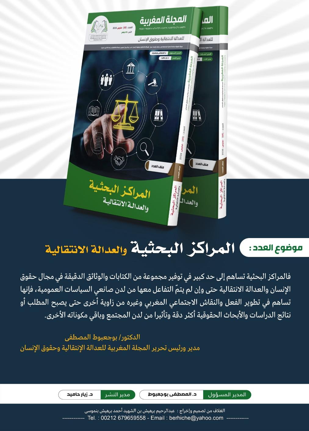 تضمن العدد الخامس من المجلة المغربية للعدالة الانتقالية وحقوق الإنسان الصادر عن المركز المغربي للعدالة الانتقالية ودراسة التقارير الدولية، موضوعًا محوريًا حول المراكز البحثية ودورها في تعزيز العدالة الانتقالية. وركّز العدد على مساهمة هذه المراكز في تطوير الفعل الحقوقي والنقاش الاجتماعي بالمغرب، من خلال توفير مكتبة غنية من الكتابات والدراسات والوثائق الدقيقة، رغم محدودية التفاعل المباشر من لدن صانعي السياسات العمومية.