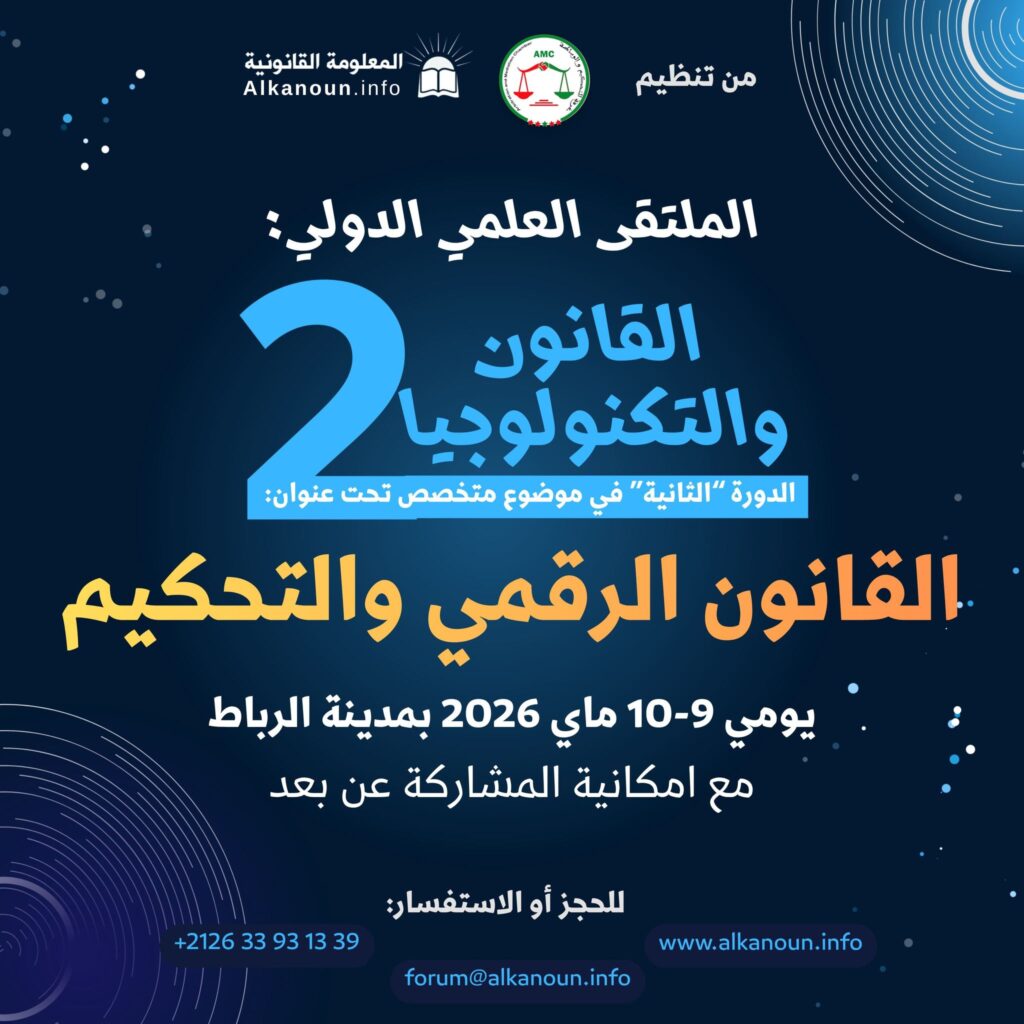 يشهد الحقل القانوني تحولات متسارعة في ظل الثورة الرقمية، ما يفرض على الباحثين والمهنيين مواكبة هذه الدينامية من خلال الانخراط في فضاءات علمية تجمع بين التأصيل والتطبيق. وفي هذا الإطار، تنظم غرفة التحكيم والوساطة، بشراكة مع المنصة العلمية “المعلومة القانونية”، فعاليات الملتقى العلمي الدولي للقانون والتكنولوجيا في دورته الثانية، يومي 9 و10 ماي 2026 بمدينة الرباط، تحت عنوان: “القانون الرقمي والتحكيم”، بمشاركة نخبة من الخبراء والمختصين.